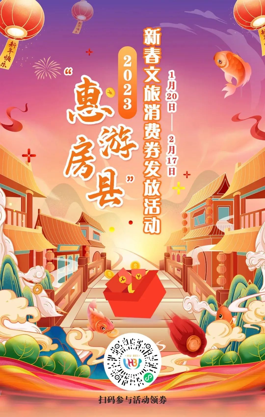 2023“惠游房縣”新春文旅消費券活動時間為2023年1月20日至2月17日。首次發(fā)券時間在2023年1月20日晚上20:00開始,發(fā)放的消費券分別為面值18元、38元、58元、88元,面向十堰市內(nèi)游客(包括入堰游客)發(fā)放,用于消費者在線下購買房縣旅游服務(wù)酒店住宿(含民宿)、景區(qū)門票(含二次消費)等消費支付時使用。