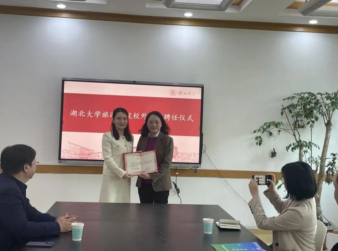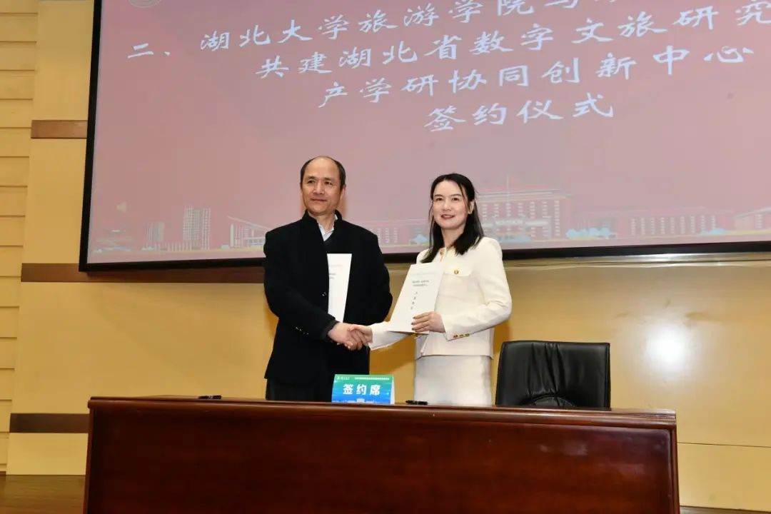 會上,湖北數(shù)字文旅集團總經(jīng)理羅圓與湖北大學旅游學院黨委書記宋鴻簽訂產(chǎn)學研協(xié)同創(chuàng)新中心共建協(xié)議,雙方將圍繞數(shù)字文旅頂層設計、科技創(chuàng)新項目申報、科技成果創(chuàng)新轉(zhuǎn)化、文旅體驗產(chǎn)品打造、人才培養(yǎng)、培訓基地打造等方面開展合作。為構(gòu)建院企協(xié)同育人機制,推動產(chǎn)學研一體化,發(fā)揮企業(yè)導師作用,羅圓還被聘任為湖北大學旅游管理專業(yè)學位碩士研究生校外導師。