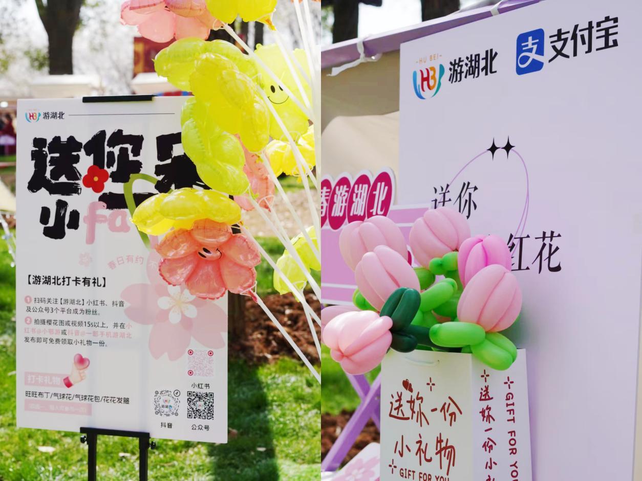 活動現(xiàn)場,游客們只需掃碼關注“游湖北”新媒體矩陣賬號,并分享賞櫻圖片或視頻至社交平臺,即可獲得旺旺布丁/氣球花/氣球花包/花花發(fā)箍等精美禮品。豐富多樣的禮品引來眾多賞花游客圍觀打卡,現(xiàn)場圈粉無數(shù)。