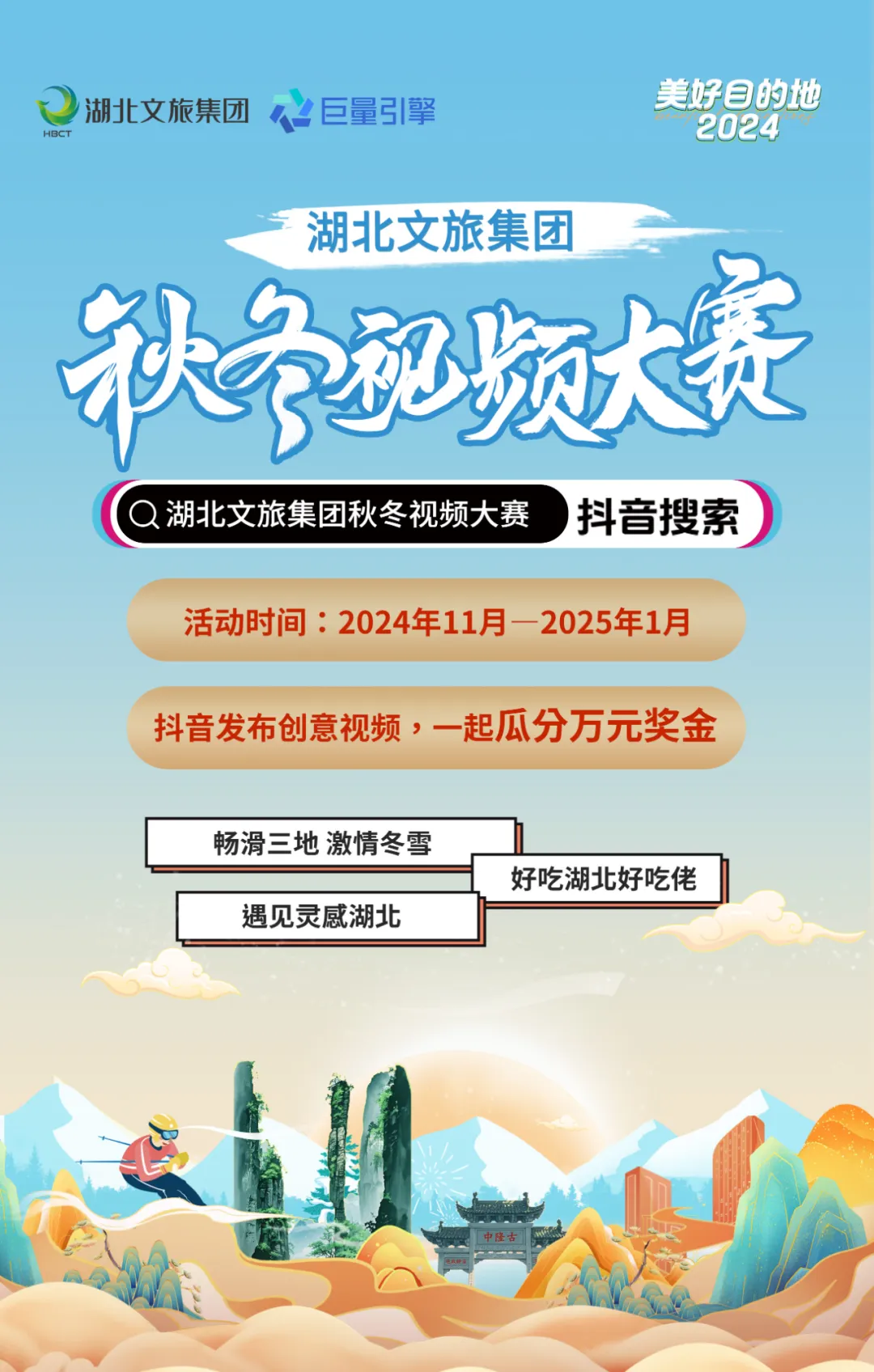 湖北文旅集團正式啟動秋冬視頻大賽,邀您共賞荊楚之美。近日,湖北文旅集團啟動秋冬視頻大賽。此次活動以“遇見靈感湖北 好吃湖北好吃佬”、“暢滑三地 激情冬雪”以及“景區(qū)代言人”為主題,鼓勵廣大網(wǎng)友通過鏡頭記錄湖北的自然風光、美食文化及冬季運動的樂趣。活動自2024年11月開始,將持續(xù)至2025年1月底。參賽者需在其個人抖音賬號上發(fā)布符合任一主題要求的原創(chuàng)視頻,并使用官方指定話題標簽“#湖北文旅集團秋冬視頻大賽”,同時添加參與拍攝內(nèi)容所涉及的湖北文旅集團旗下任意景區(qū)的位置信息。此次活動不僅是對湖北豐富旅游資源的全面展示,也為廣大攝影愛好者提供了展現(xiàn)才華與創(chuàng)意的舞臺。