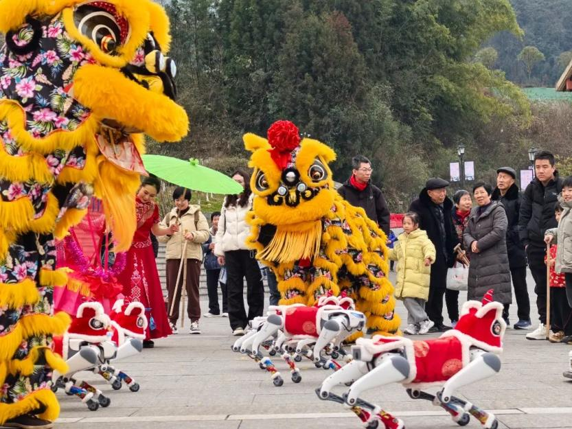 科技過(guò)年,機(jī)器狗成新春“網(wǎng)紅”。正月初一至元宵節(jié),數(shù)旅集團(tuán)聯(lián)合恩施大峽谷推出的“機(jī)器狗”春節(jié)舞蹈隊(duì)將在景區(qū)開(kāi)展迎賓、舞蹈一條龍服務(wù)。機(jī)器狗舞蹈隊(duì)展示迎賓舞蹈、參與舞獅互動(dòng)、太空步融合土家擺手舞,科技感和民俗范在峽谷山水間擦出火花。為游客帶來(lái)全新的游覽體驗(yàn),增添節(jié)日樂(lè)趣,提升景區(qū)的服務(wù)質(zhì)量和吸引力。